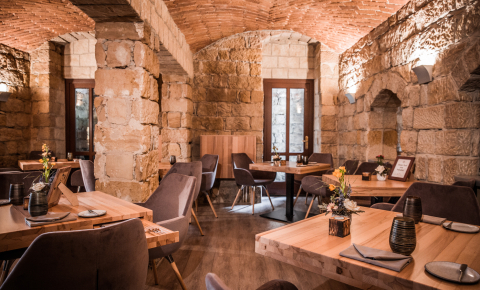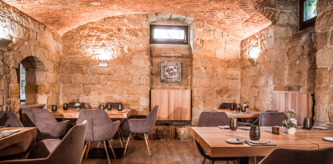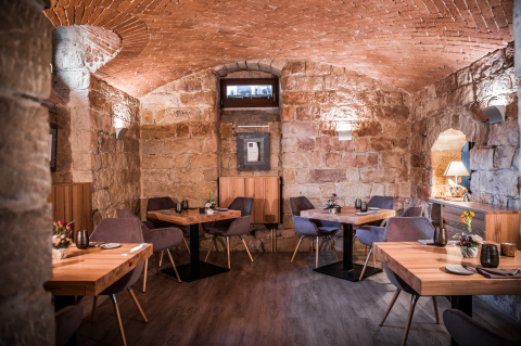 In the vault you sit at tables for two and always have everything in view from your table. In the middle of the room is a sandstone column. This allows for groups only in certain table constellations.